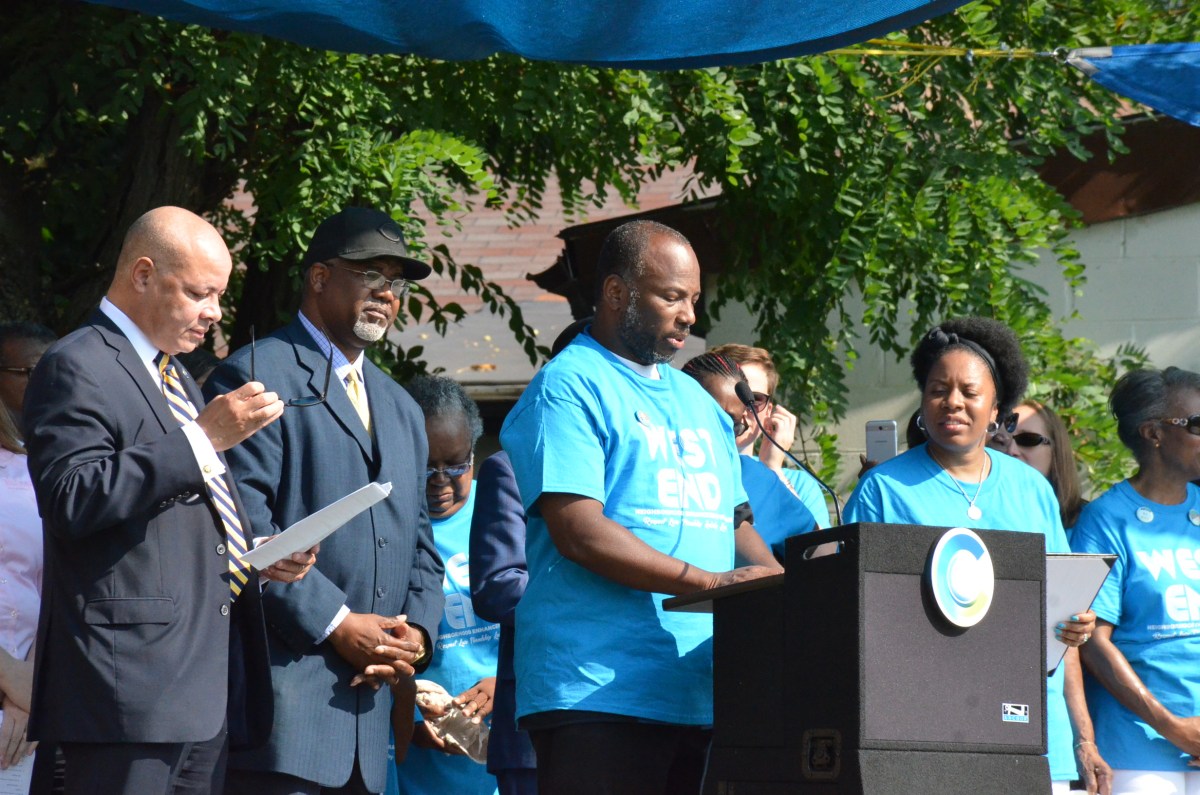 Keith Blake, president of West End Community Council, helps kickoff the West End Neighborhood Enrichment Kickoff. At left is City Manager Harry Black, and Pastor James Strayhorn of Bright Star Community Church. To the right of Blake is Alexis Kidd, executive director of Seven Hills Neighborhood House in the West End. Herald photo